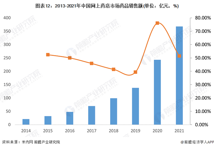 2013年-2019年,网上药店市场规模从13亿元增至138亿元。年轻白领成为网购药品主力军,他们选择网购渠道的原因前三位分别是:在线下单送货上门,足不出户即可完成购药过程;价格实惠、透明;药品种类应有尽有,有更多的选择。此外,网上药店对产品的评价互动充分可视,让消费者可以结合自身情况购买;另外还能减少消费者购买敏感药品而产生的尴尬。根据米内网公布的数据,2021年中国网上药店市场药品销售额达368亿元,同比增长51.44%。