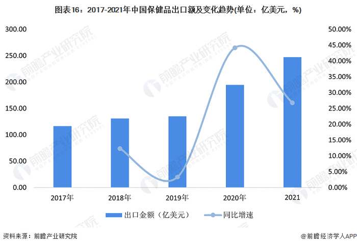 从保健品出口情况来看,2017-2021年中国保健品行业相关的产品出口规模逐年增长,其中,2021年出口金额达到247.11亿美元,同比增长26.77%。