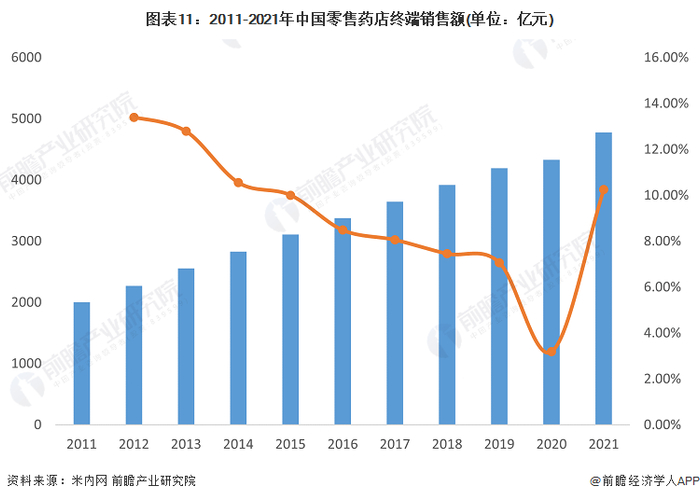主要为保健品的流通企业,主要包括各大超市、医院、药店、直营店和电商等。从下游整体需求来看,以药品零售规模为参照指标,2011-2021年,中国药店终端药品销售额呈现增长趋势,米内网公布的数据显示,2021年药店终端药品销售额为4774亿元,同比增长10.25%。