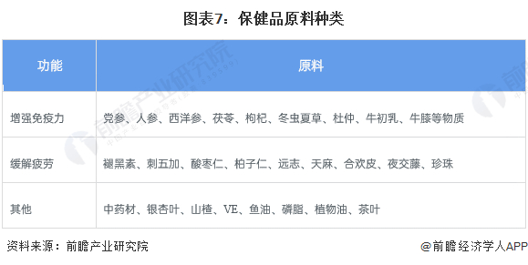 保健品原料包括植物类、动物类、真菌类、益生菌类、生物活性物质类等,其中植物类原料占据了重要的位置。从占比较大的具有增强免疫力功能保健品分析,国家食品药品监督管理局(SFDA)已批准具有增强免疫力功能的常用原料有:党参、人参、西洋参、茯苓、枸杞、冬虫夏草、杜仲、牛初乳、牛膝等物质。