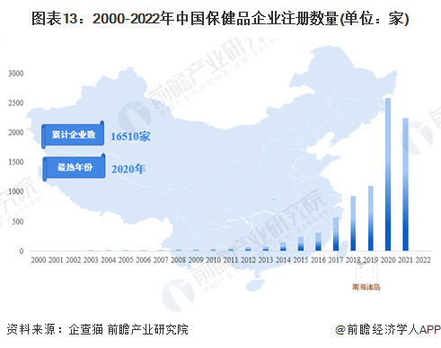 根据中国企业数据库企查猫,目前中国保健品行业的主要企业共有16510家,其中以2020年为主要注册热潮,2020年注册企业数量为1370家,而2021年则为1306家。