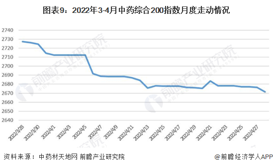 从价格来看,2022年4月中药材综合200指数报收于2671.58,点位与3月28日的2727.50点相比,指数下跌2.05%;盘中最高点位为2727.50点,最低点位为2671.58,振幅为2.05%。在4月月度环比监控周期内,中药材流通市场受疫情反复的影响明显,一方面是部分区域静态管理导致物流等因素受限,货源难以流通,另一方面如安国中药材市场、磐安中药材市场、临沂金银花市场和抚松人参市场等都受疫情影响而闭市,商家难以进行货源的组织。