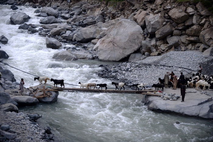 当地时间9月1日,在巴基斯坦开伯尔-普什图省斯瓦特地区,牲畜通过一座临时搭建的小桥。