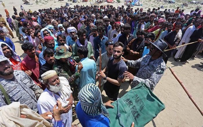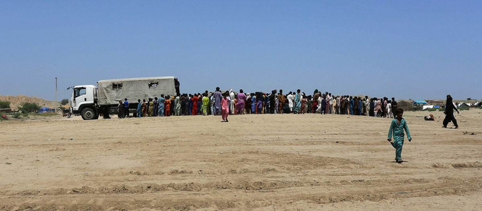 当地时间2022年8月27日,巴基斯坦海得拉巴,当地遭遇洪灾,灾民排队等候领取救灾物资。
