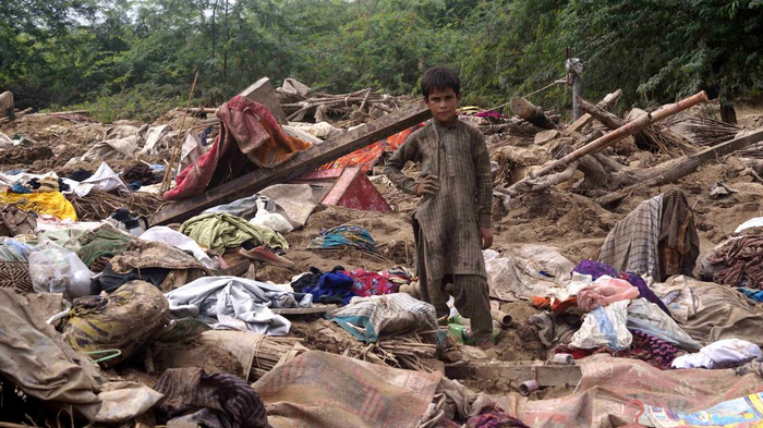 当地时间2022年9月4日,巴基斯坦开伯尔-普什图省,一个小男孩在灾后的废墟中。