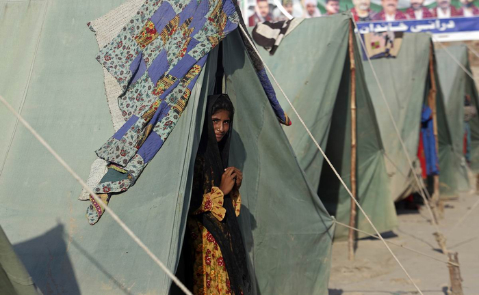 当地时间2022年8月31日,巴基斯坦信德省的希卡布尔,因洪水失去家的女孩住在帐篷里。