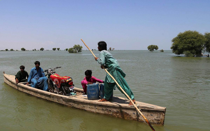 当地时间2022年8月31日,巴基斯坦塞危,流离失所的人乘船离开灾区。