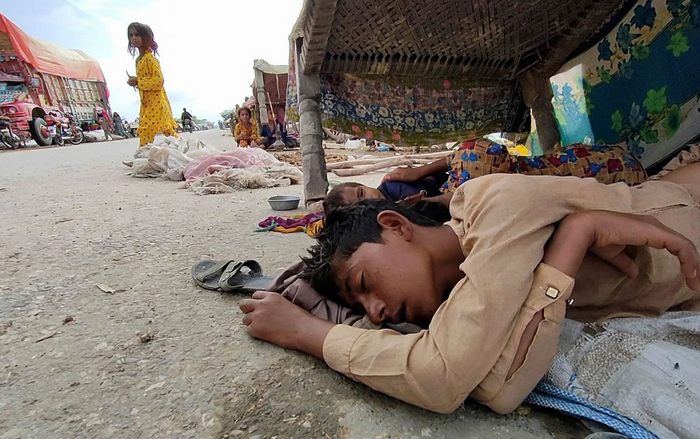 当地时间2022年9月2日,巴基斯坦俾路支省,灾后流离失所的儿童在路边睡觉。