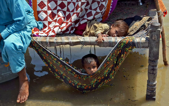 当地时间2022年8月31日,巴基斯坦贾法拉巴德,季风雨过后,孩子们坐在水中的绳床上。