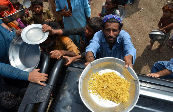 当地时间2022年8月30日,巴基斯坦索巴特普尔,暴雨过后,灾民排队领取食物。