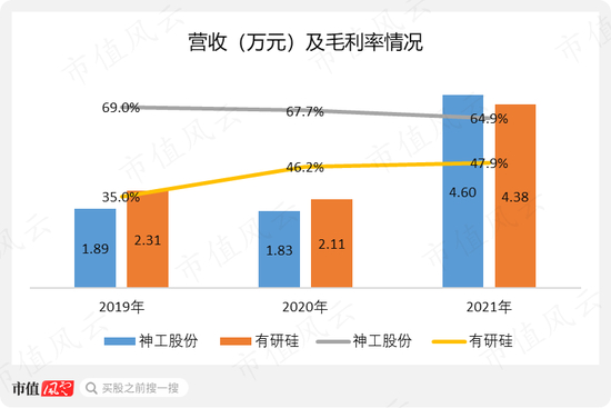 不过,神工股份的毛利率一直要高于有研硅20个百分点左右,虽然有研硅强调这跟神工股份所在地电费和人工成本低均有关,但神工股份覆盖的尺寸范围更广(8英寸-19英寸),且主要集中在毛利率更高的大尺寸业务也一定是主要原因之一。