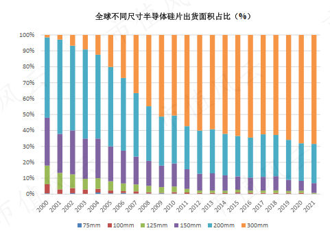 2008年以前,8英寸(200mm)硅片是全球半导体市场的主流硅片。2008年,12英寸(300mm)硅片自首次超过8英寸,成为全球半导体市场的新潮流。2021年,全球12英寸半导体硅片的出货面积占比接近70%。