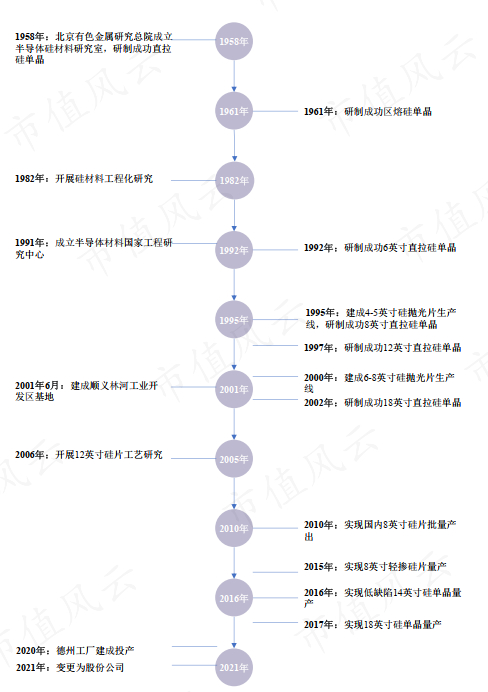 有研硅前身最早可追溯到1958年成立的北京有色金属研究总院(后改制为有研科技集团有限公司,以下简称“有研总院”),1995年率先拉制出国内首枚8英寸硅单晶,2006年在12英寸硅片领域实现技术突破,2010年开发出满足90纳米需求的12英寸硅片。