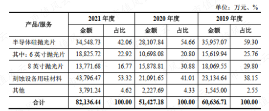 从收入构成看,半导体硅抛光片和刻蚀设备用硅材料是有研硅两大主要收入来源,其中半导体硅抛光片营收占比稍高,2020、2021年受生产基地搬迁影响,2020年营收下滑,2021年增速低于同行,并不是该业务在景气周期业绩下滑。