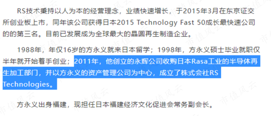 2011年,收购日本Rasa工业的半导体再生加工部门后,方永义组建了RS Technologies,后者于2016年在东京证券交易所主板上市(代码:3445)。