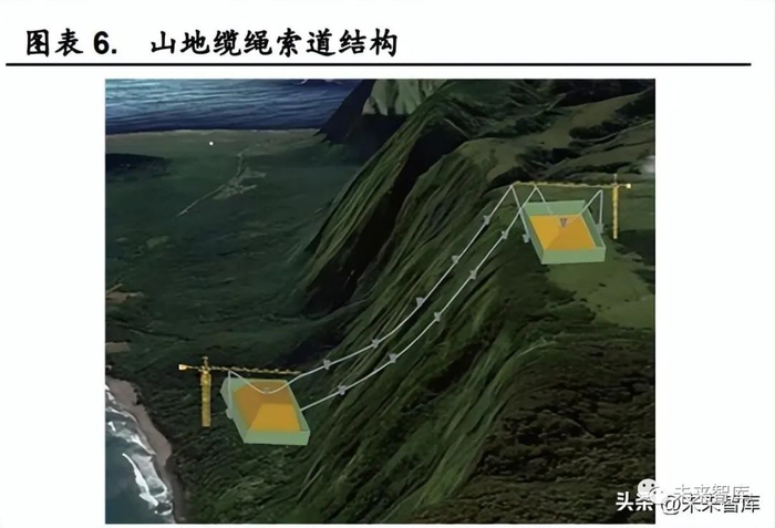 基于山体落差的重力储能结构能够降低安全风险,实现连续大规模储能。ARES 公司轨道车辆储能系统的工作原理:通过起重机将沙砾等运送到山顶,在沙石运回山下时将重力势能转化为电能。后期演变成多电机多绞盘分段储能,连续作业,利用传送链提升重物方案可以减少能量损耗,安全性足以支撑长时间连续工作。该储能系统对环境影响小,利用重物储能和释能,且没有坍塌风险,结构稳定,易实现大规模安全储能。轨道车辆储能系统建设成本较高,且需要依靠山地地形,因此其发展受到制约。山地缆绳索道结构工作原理:由两个平台连接而成,每一个平台都由一个类似矿山的砂砾储存站和一个正下方的加砂站组成。阀门将沙石填放入筐内,然后通过起重机和电机电缆将其运送到高海拔平台。通过将沙石运回低海拔平台,从而将重力势能转化为电能。此系统发电功率较小,并且受外部环境影响较大。