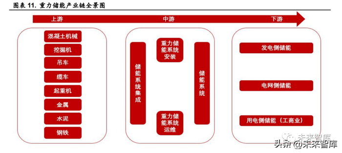 中游储能系统集成商或将成为重力储能产业链主角。产业链上游以建设原材料(水泥、金属、钢铁等)和装备为主,中游为储能系统集成商,下游应用分布在发电侧、电网侧以及用户侧。