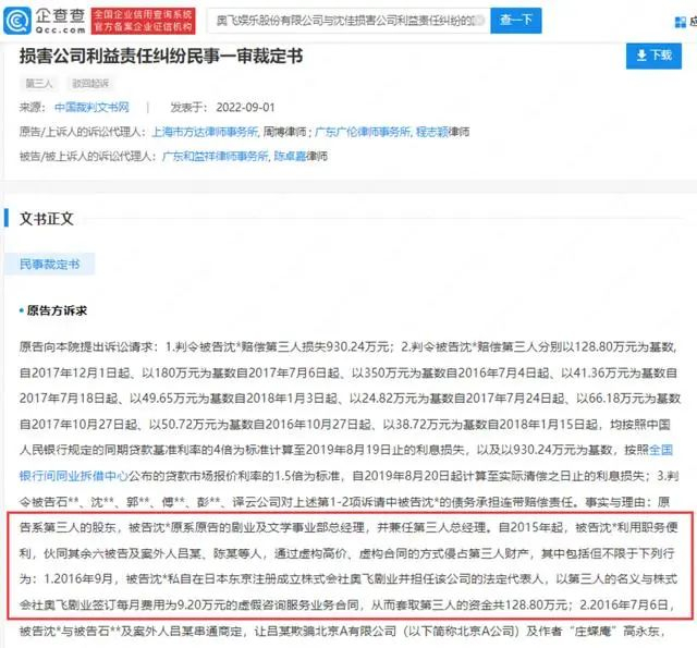 随着奥飞娱乐股份有限公司与沈某损害公司利益责任纠纷的案件一审判决书公开,从文书中可以得知,被告沈某原系奥飞娱乐的剧业及文学事业部总经理,并兼任原苏州奥飞影视有限公司总经理。自2015年起,被告沈某利用职务便利,伙同其余六被告及案外人吕某、陈某等人,通过私自在日本东京注册成立株式会社奥飞剧业,以苏州奥飞影视名义与株式会社奥飞剧业签订虚假咨询服务业务合同,并通过欺骗取得《爱因斯坦与上海神秘人》《星云物语》授权,《桃花缘》剧本委托创作及《端脑》责任编剧合作等,以虚构高价、虚构合同的方式侵占损害原苏州奥飞影视有限公司财产930余万元。