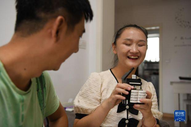 9月7日,张晨(右)与丈夫唐闻泽在位于安庆的家中交流。1999年,因病导致双目失明的张晨进入安徽省安庆市特殊教育学校读书。在那里,她完成高中学业,考入长春大学特殊教育学院音乐表演专业。大学毕业后,张晨回到安庆市特殊教育学校,成为一名老师,负责盲文教学的同时,也给盲生们教授音乐课程。张晨用音乐给盲生打开了一扇窗,让他们在音符中感受生命的色彩。“希望通过我的经历告诉学生们,不要给自己设限,人生还有很多的可能性。”张晨说。新华社记者 张端 摄