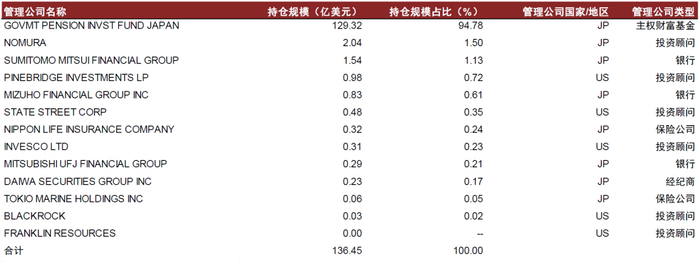 日本机构型MBS的投资者主要有主权财富基金、投资顾问、银行、保险公司和经纪商。从彭博终端的不完全统计数据来看,日本机构型MBS持仓规模较大的有日本政府养老投资基金,截至2022年8月24日,持仓规模约130亿美元。除了本国的投资者,日本机构型MBS的投资者还有来自美国的投资者(比如美国道富银行、景顺资产管理公司)。