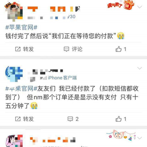 昨晚8点,iPhone14系列手机预售刚开始,便有部分网友反馈Apple商店崩了。有网友表示,自己已经付完款了,但是官网还提示“我们正在等待您的付款”。