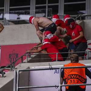 随后,法国警方、球场安保人员介入,三方缠斗在一起,场面一度相当混乱。最终,足球流氓群体在警方的驱逐下溃散,其中一人在逃跑过程中摔下看台,被紧急送往医院治疗,目前已无生命危险。