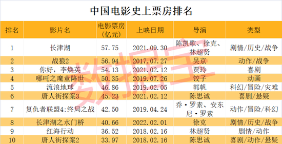 从历史数据来看,证券时报·数据宝统计,中国电影史上票房冠军大多与暑期或节日档相关。影史上票房第一名的《长津湖》于2021年国庆节前一天上映,斩获票房57.75亿元。票房第二名的《战狼2》在2017年暑期档上映,收获票房56.94亿元。票房第三名《你好,李焕英》于2021年春节上映,斩获票房54.13亿元。