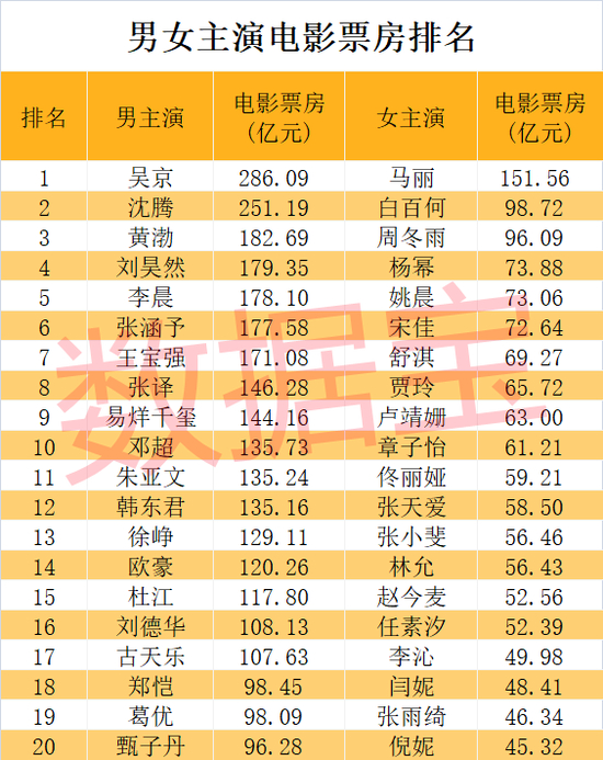 女主演方面,马丽以152亿元问鼎女主演票房冠军,她是开心麻花团队最早的成员之一。白百何、周冬雨分获亚军、季军,两者票房均超90亿元。杨幂、姚晨、宋佳、舒淇、贾玲等票房紧随其后。