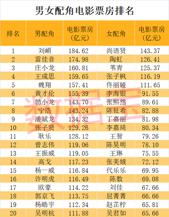塑造配角,可以填补主角人物设定中缺少的部分,打造与主角截然不同的人物形象。中国影史上,黄金配角的出现为电影增色不少。数据宝统计,共30位中国籍男配角演员累计票房超百亿。电影票房最高的男配角是80后演员刘頔,累计票房185亿元,其参演过《十月围城》、《中国合伙人》、《亲爱的》、《新喜剧之王》、《解救吾先生》等。男配角票房亚军、季军分别是雷佳音、庄小龙。