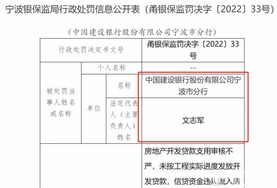 4月7日,宁波银保监局核准了文志军建行宁波市分行行长的任职资格,之后4月21日,建行宁波分行因房地产开发贷款支用审核不严,未按工程实际进度发放开发贷款,信贷资金违规流入房地产领域,贷前调查不尽职、贷款资金被挪用,保险代理业务管理不规范,监管统计数据不准确等违法违规事实被宁波银监局罚款260万元。
