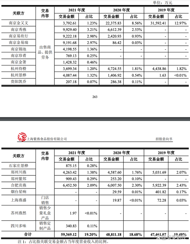 其中,邓绍彬是紫燕食品实际控制人邓惠玲的兄弟,南京金又文、杭州侍橙等经销商是邓绍彬控制的企业,是紫燕食品于南京、杭州等地区的经销商。报告期内,紫燕食品与该等公司发生的关联交易金额分别为3.64亿元、3.79亿元和4.74亿元。