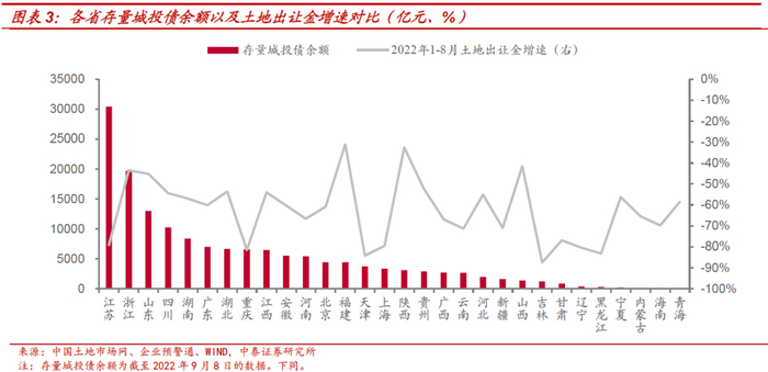 2022年1-8月,存量城投债规模最大的前十个省份中,土地出让金下滑较明显的省份包括江苏、四川、湖南、广东、湖北、重庆、江西、安徽,同比降幅分别为79.04%、54.38%、56.93%、60.11%、53.63%、81.45%、53.96%、60.34%。