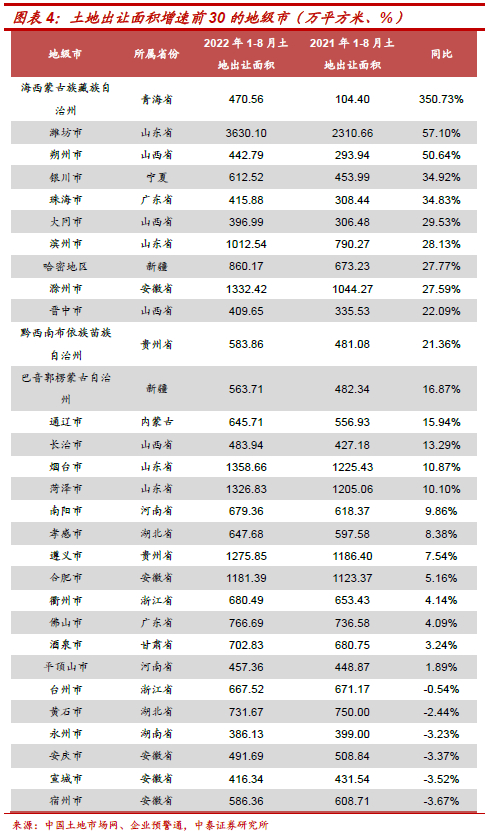 由于增速靠前的地级市多为土地出让面积及土地出让金绝对值较小的地级市,因此我们选择在土地出让面积及土地出让金规模前100的地级市范围内,分析其同比变化。