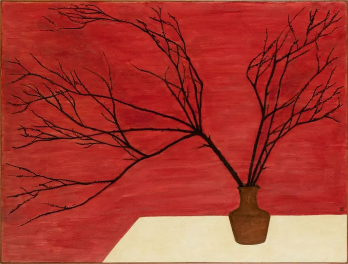 常玉《红底瓶枝》油画木板,一九六三年三月作