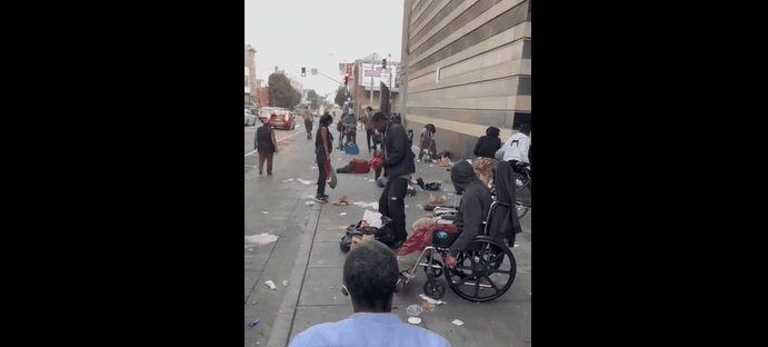 视频中,一群无家可归者聚集在人行街道上,地上满是垃圾。两名男子在街上扭打着,其中一人还赤裸上身,旁边还有一个身穿白色卫衣的男子拿着扫帚殴打其中一名打架者。