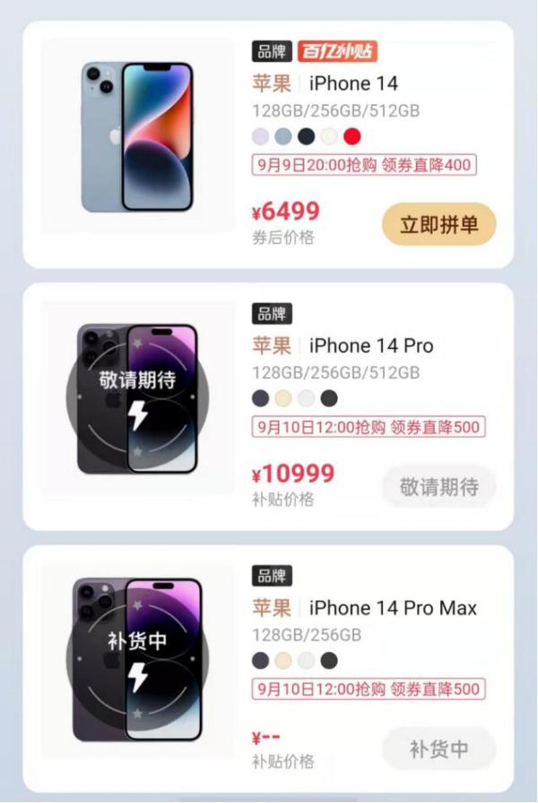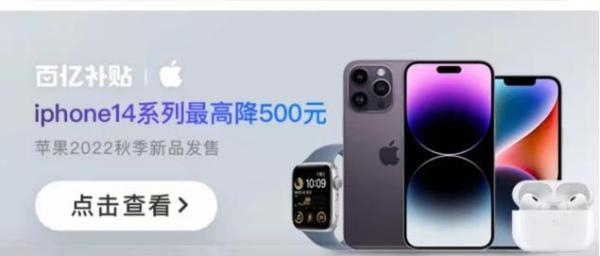在拼多多平台,9月9日晚间,在百亿补贴专场,iphone 14系列领券最高降500元。