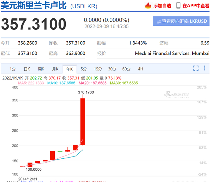 美元兑斯里兰卡卢比已经从2014年底的131.11一度升至今年最高的370.17,大涨1.82倍。以此计算,近7年来斯里兰卡兑美元最高贬值达65%。