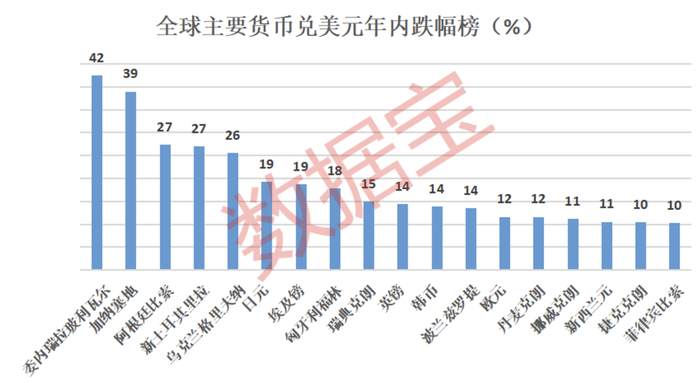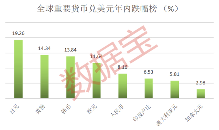 证券时报·数据宝统计,今年以来全球已有18种货币兑美元的汇率跌幅超过10%,5种货币跌超20%。全球五大结算货币中的四大货币兑美元全线下跌,日元跌逾19%居首,人民币表现最为坚挺,跌超8%。