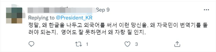 多家韩媒曝光此事后引发不小的争议,有韩媒称,这真是“丢脸丢到国外去”。一位韩国网民在尹锡悦发布的相关帖文下写道:“为什么不用韩文非要用外语写啊,丢这样的脸。韩国国民都要用翻译器看他的帖文。英语也不好,逞什么能。”↓