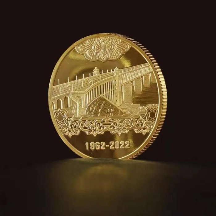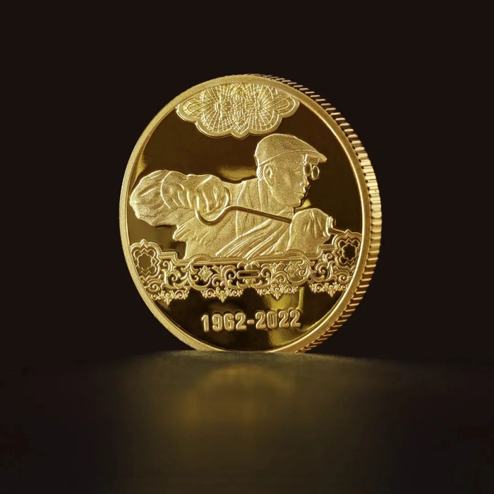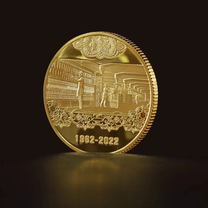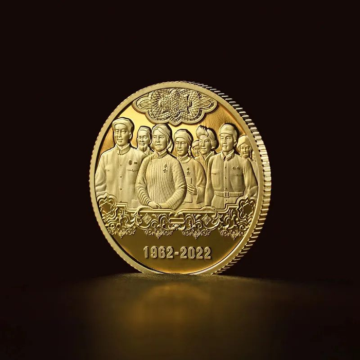 纪念章以砂面结合花纹浮雕凸亮,每一个人物的轮廓经过多层次雕刻,细腻而完整,仿佛真实地站在我们眼前。纪念章背面上方为簇拥的花团,下方为万里长城,在镜面的映衬下,“60周年”标识分外耀眼。