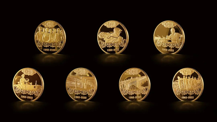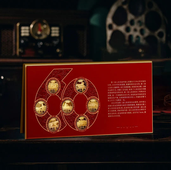 为纪念第三套人民币发行60周年,经中国人民银行营业管理部行政许可图样使用,中国钱币有限公司装帧出品第三套人民币发行60周年纪念章一套,该套纪念章共7枚,材质为纯铜镀黄金,直径27mm,限量发行1万套!