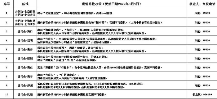 对于从该机场出发的旅客,则应凭48小时核酸检测阴性报告及行程卡绿码进入机场。对市内吉水县、永丰县、新干县、峡江县、吉州区、青原区登机人员进行劝返。井冈山市其他县(市、区)人员需持24小时核酸阴性证明、健康码、行程码绿码。截至9月9日12时,在常态化疫情防控的基础上,各地、各航司另有具体疫情防控措施要求。