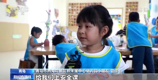 青岛市西海岸新区积米崖中心幼儿园小朋友 管佳怡:他跟我们一起踢足球,给我们上安全课,还跟我们一起户外活动。
