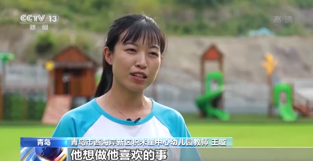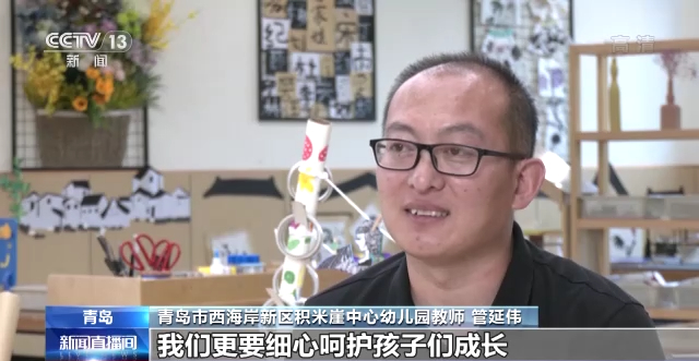 青岛市西海岸新区积米崖中心幼儿园教师 王璇:管老师跟孩子们互动时,特别有张力有活力,而且孩子们在他的带动下都变得特别自信,特别勇敢。比如当小朋友有自己想法的时候,想做他喜欢的事,管老师会支持他鼓励他,但是同时也会引导小朋友正确遵守幼儿园的规则。