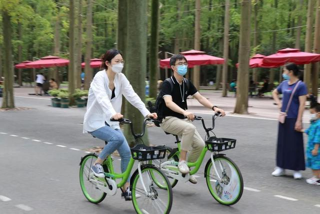 另一边,西沙明珠湖景区同样有不少游客前来游玩。明珠湖是崇明最大的天然淡水湖泊,湖水清澈、环境幽雅,自然风光秀美。在湖畔草坪,市民搭起帐篷与大地亲密接触,还有市民租借了景区内的交通运输工具,进行环湖骑行。