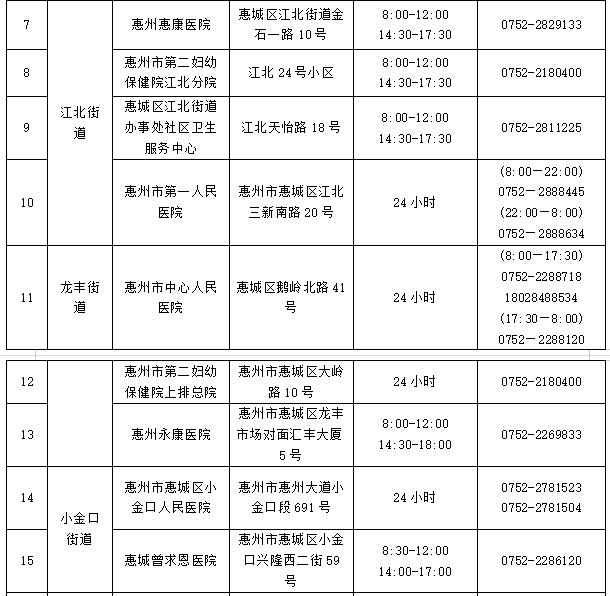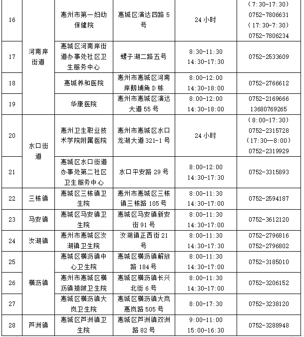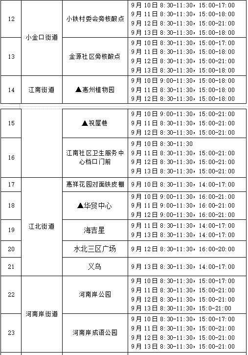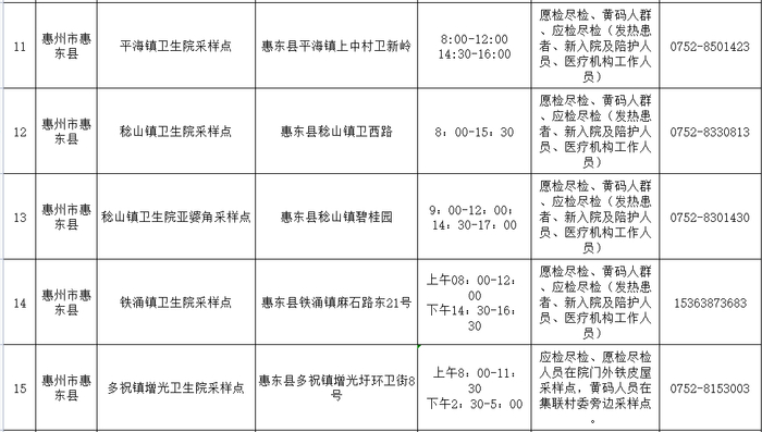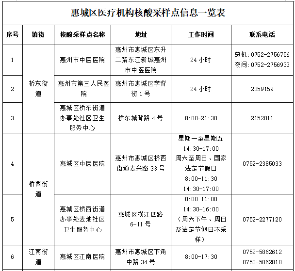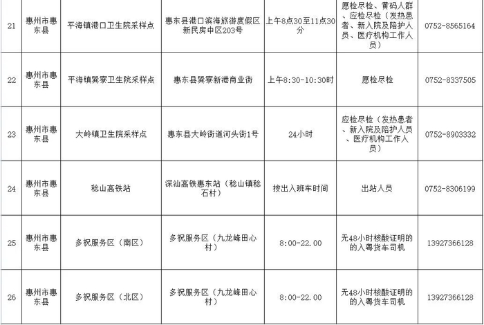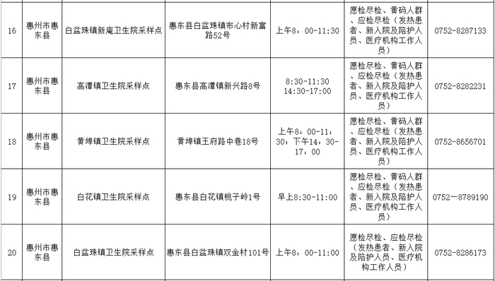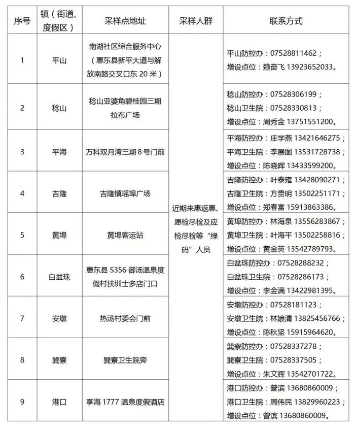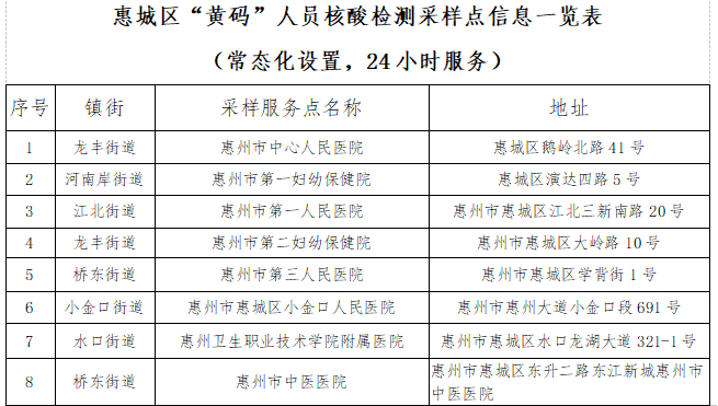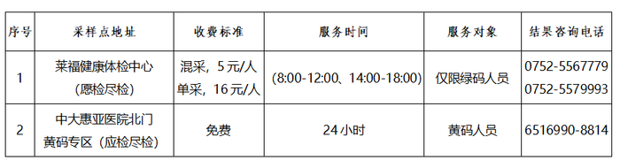 注:以上采样点均为免费核酸检测,服务对象是近期离惠返惠、愿检尽检及应检尽检人群,服务时间为正常上班时间并结合群众需求适当调整,如有变化将及时向社会公布。