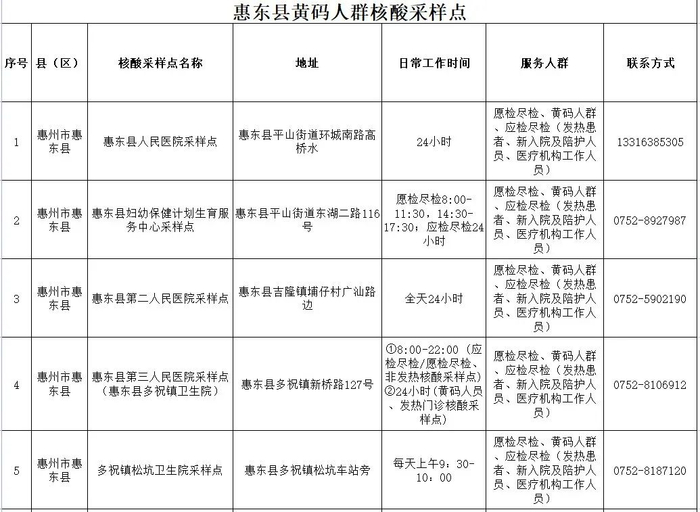 为进一步做好新冠疫情防控工作,满足广大群众对核酸检测的需求,充分发挥核酸检测“排雷”作用,结合实际,惠东县从即日起对黄码人群采样点进行调整,在惠州市0904本土疫情结束前,黄码专区采样点提供24小时采样服务,疫情结束后将恢复日常工作时间,调整后的核酸检测采样服务点信息详见附表。请广大市民选择就近的黄码人员采样点进行核酸采样。