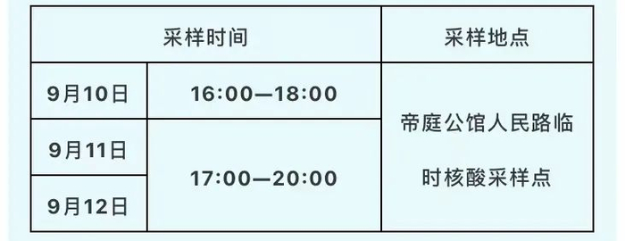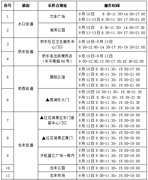 9月12日 9:00-15:00,东山森林公园、文化广场、义和广场。再次提醒:只针对学生进行核酸采样。