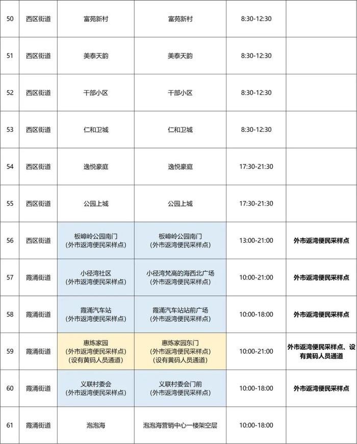 全区共设置便民核酸采样点91个,其中:免费核酸采样点90个【①对外免费核酸采样点61个(详见附表1),②内部采样点24个,为较为封闭小区、厂区,③黄码专区1个(详见附表2),④合署办公采样点5个】;“愿检尽检”自费核酸采样点1个(详见附表2)。请广大市民朋友按照村(社区)通知有序前往采样点采样。