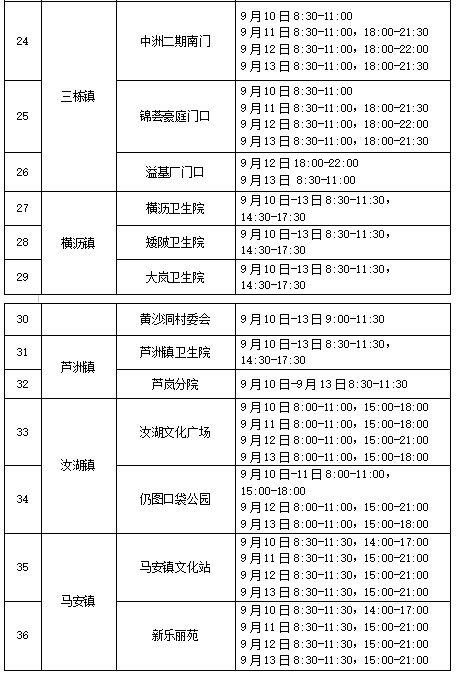 根据惠城区疫情防控形势,为有效管控疫情传播扩散风险,做好常态化疫情监测预警,切实保障广大人民群众生命安全和身体健康,满足广大市民朋友核酸检测需求,方便“中秋”假期来(返)惠人员核酸检测,惠城区9月10日至9月13日开设36个临时免费核酸采样便民服务点:
